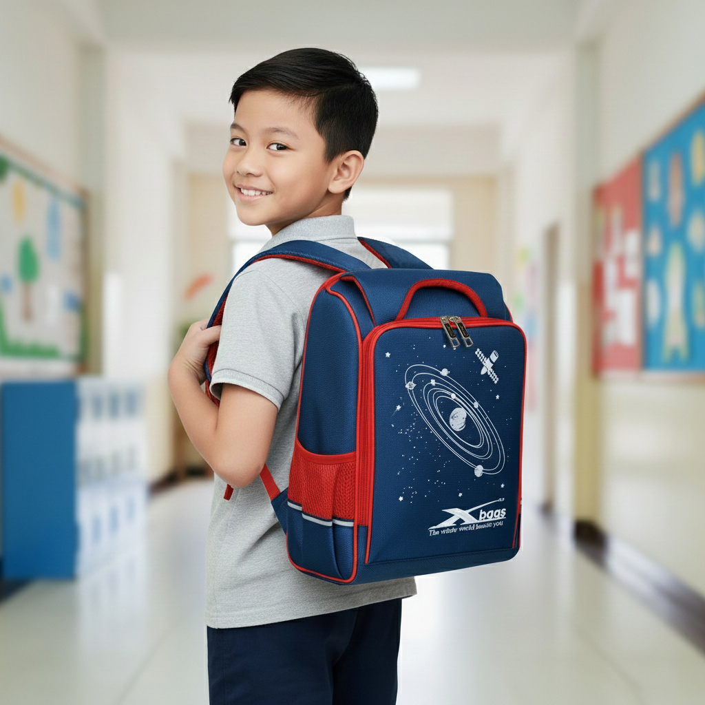 Với tone màu xanh đen chủ đạo, kết hợp viền đỏ, balo chống gù lưng Xbags Universe mang lại cảm giác tươi sáng, năng động, đầy cá tính, thu hút sự chú ý của học sinh; giúp các bé hào hứng, tự tin khi tới trường.