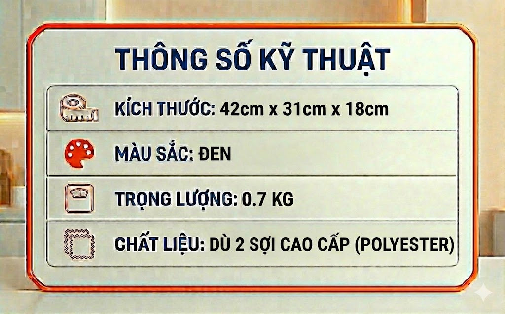 Sản phẩm có kích thước chuẩn 42 x 31 x 18cm, bao gồm 2 ngăn chính lớn để chứa laptop, tài liệu, đồ dùng phục vụ công việc và 2 ngăn phụ nhỏ bên hông dùng đựng các vật dụng nhỏ gọn, mà người dùng cần sử dụng thường xuyên.