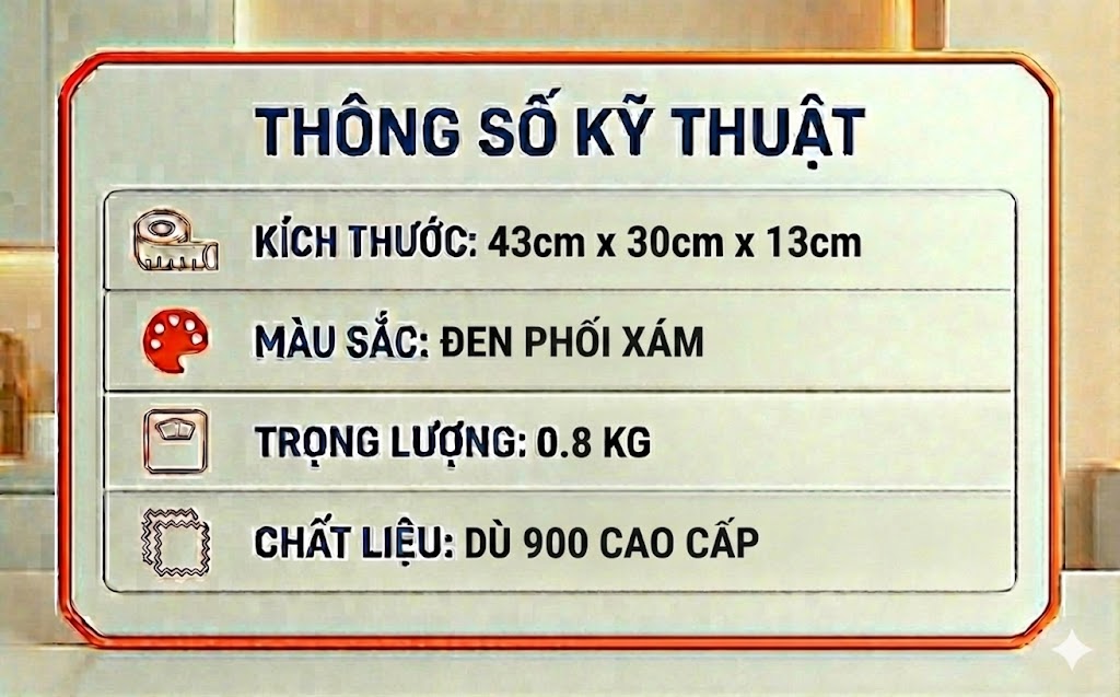 Sản phẩm có kích thước chuẩn 43 x 30 x 13cm, được thiết kế thành nhiều ngăn kết hợp các ngăn phụ nhỏ phía trước và hai bên hông rất tiện lợi.